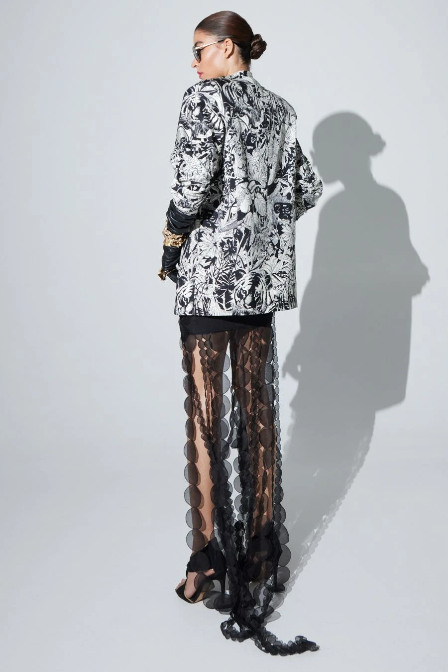 Step into a realm of enchantment with this Petra hand-embroidered skirt. Each intricate stitch tells a story of timeless craftsmanship and artistry. The circle fringes add a whimsical touch, creating an aura of elegance and allure.