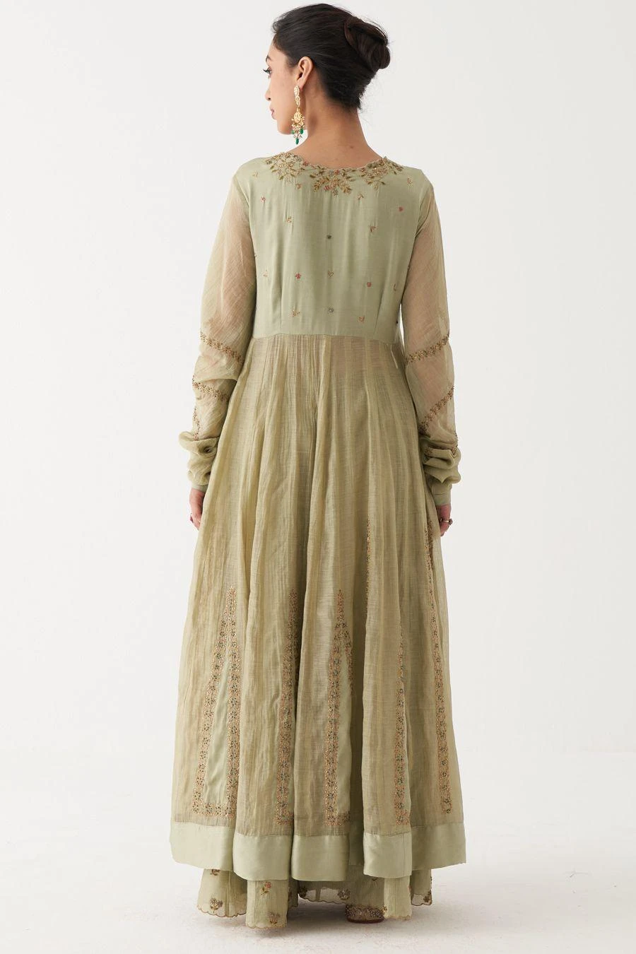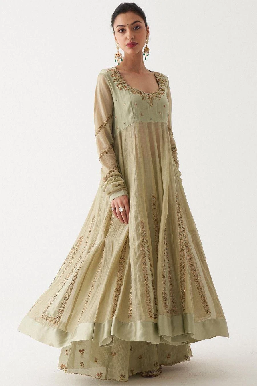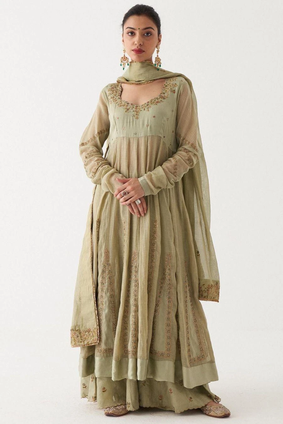 This set will see you through all kinds of celebrations this festive season. Handcrafted with ari and zardozi work, this set comes with a deep aubergine silk anarkali and tonal pants paired with a tonal tissue chanderi dupatta.