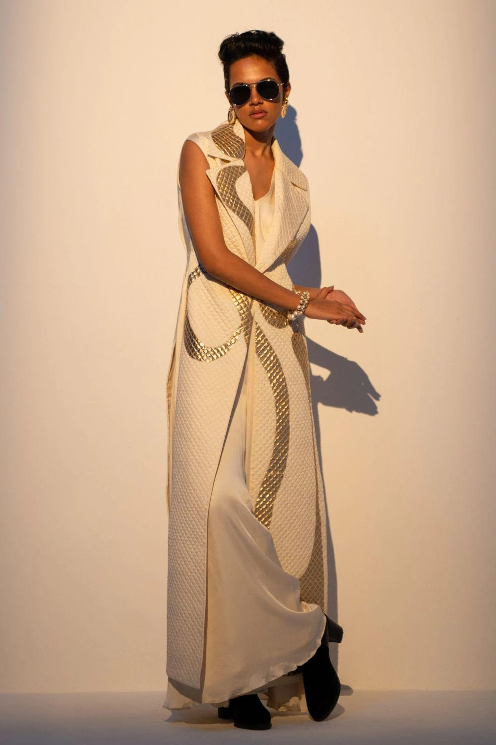Radiate sophistication in this beige quilted maxi adorned with intricate gold applique, perfectly paired with a beige bias jumpsuit. A harmonious blend of modern elegance and intricate design.