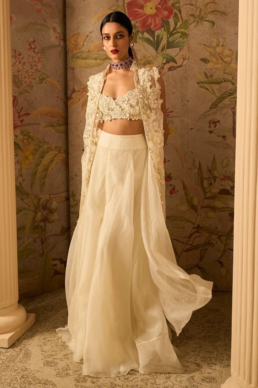 Look effortlessly stylish with this jacket set. Crafted in organza and net, this set features a pearl embroidered blouse paired with an equally versatile jacket & sharara pants.
