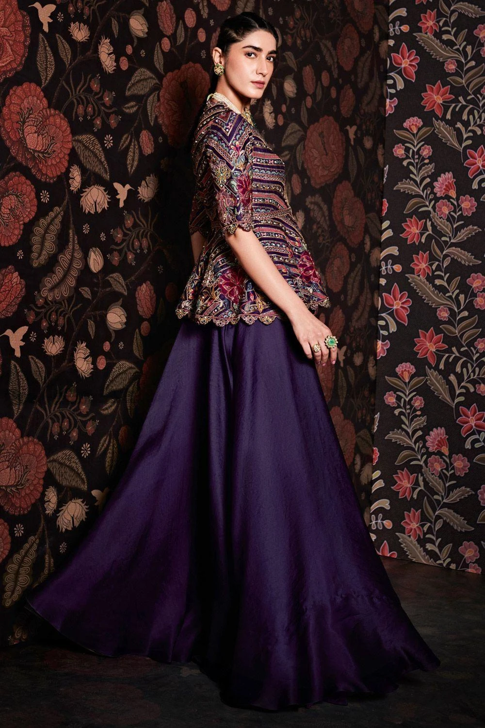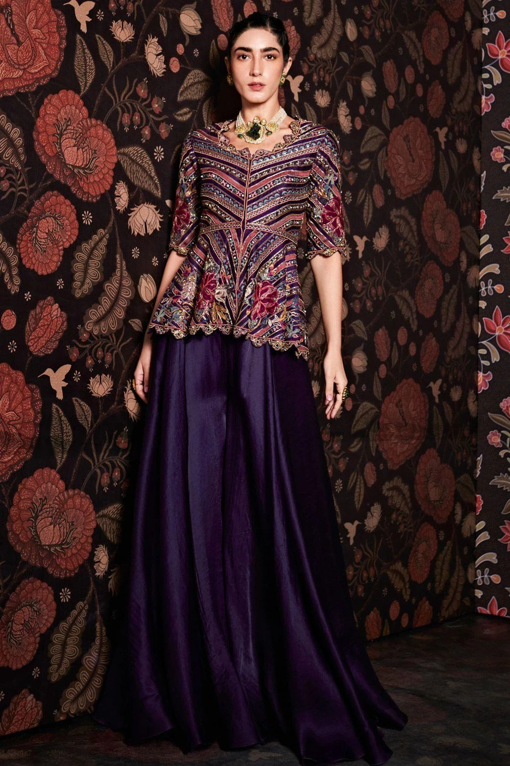Elevate your wedding wardrobe with this purple embroidered raw silk peplum & organza sharara set. Style this chic set with statement earrings & a clutch to complete the look.