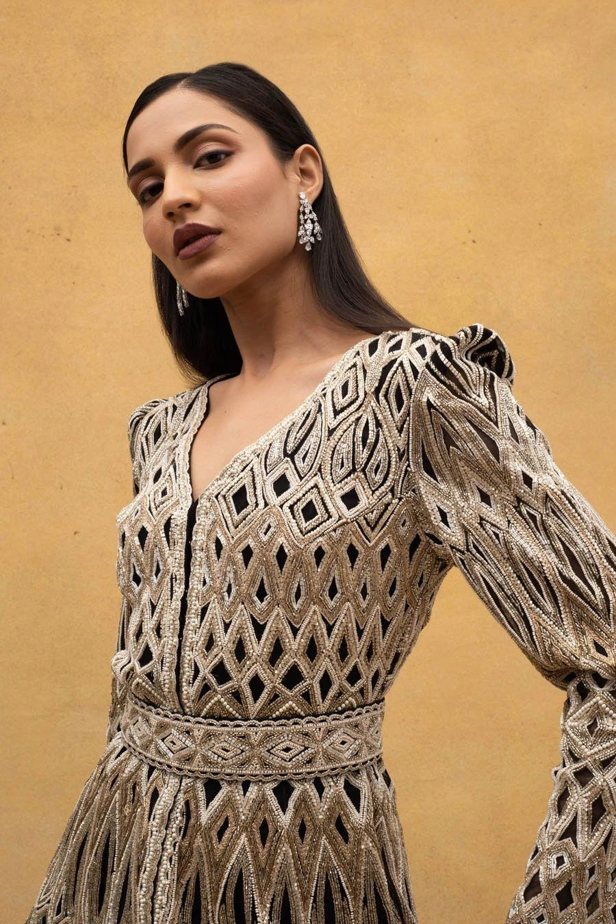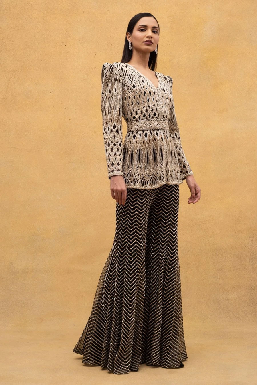 For your wedding adjacent celebrations or festive occasions, this gold & black sharara set is a great option for a relevant yet rooted look. It features a short, full sleeve embroidered kurta, paired with an equally versatile sharara.