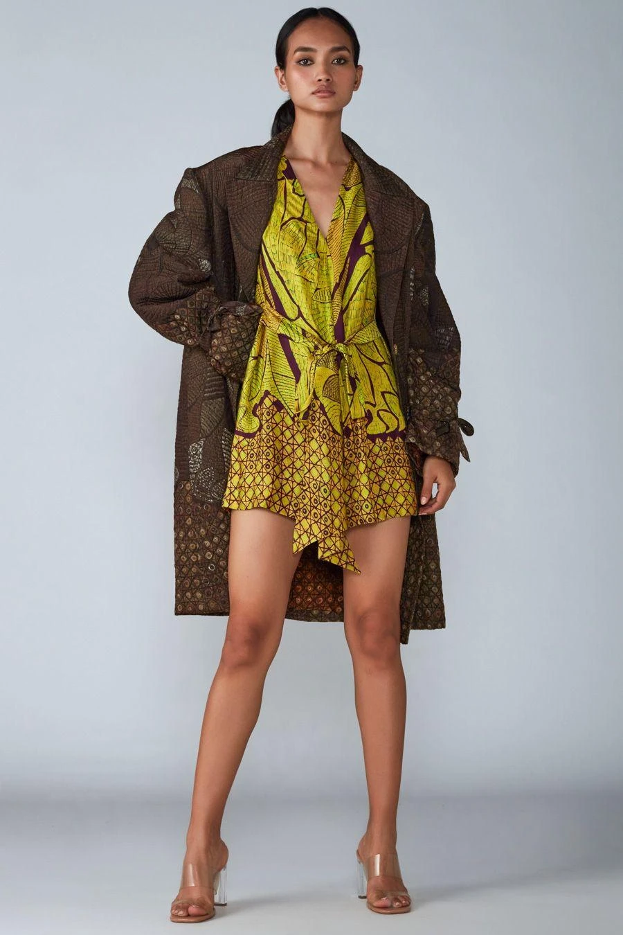 Add a layer of glamour & statement style to resort getaways with this playsuit. Crafted in satin, this belted jumpsuit features an abstract tile print all over. Pair it with the Brown tile printed quilted coat from the collection to complete the set.