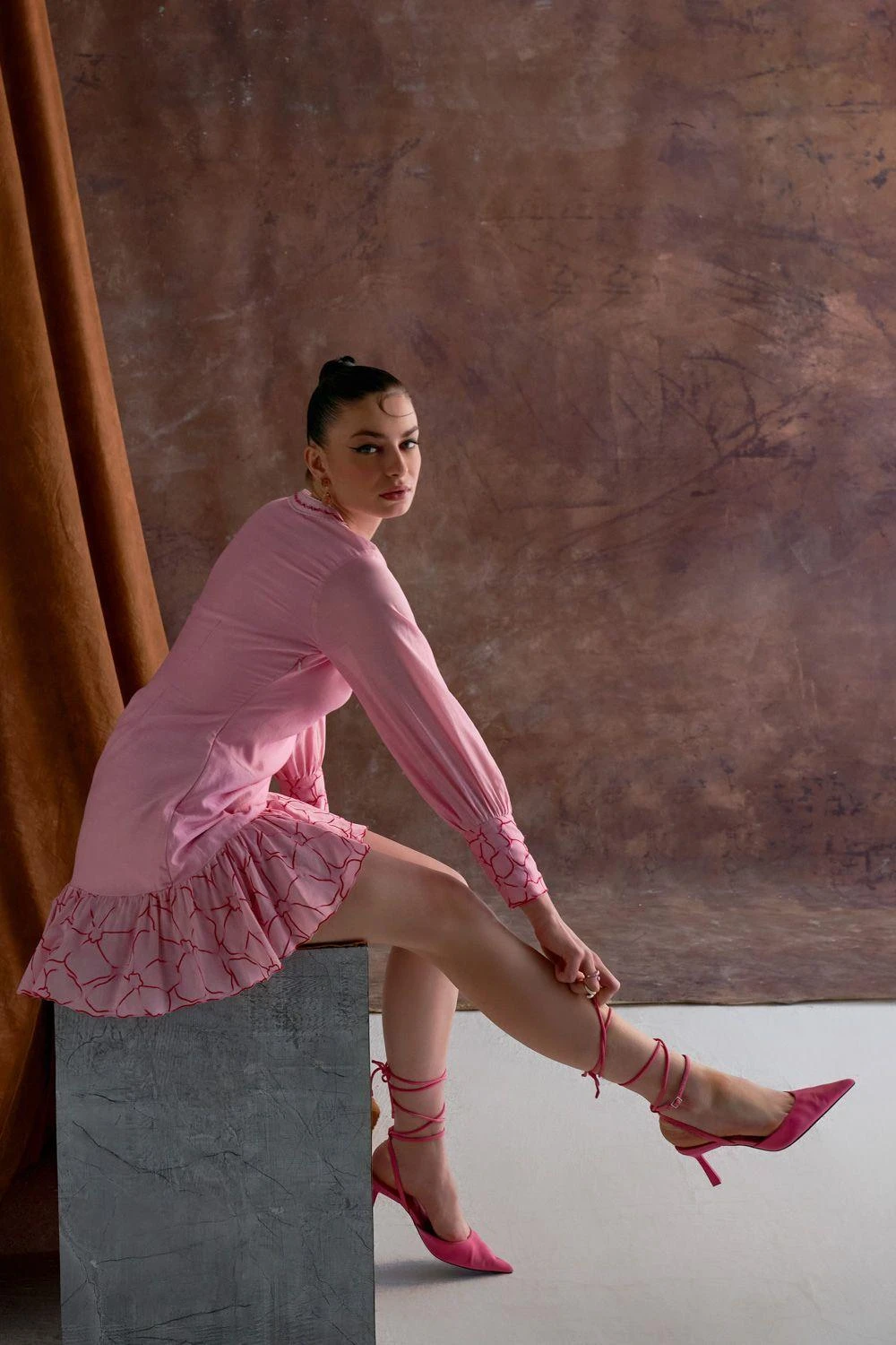 Indulge in the exquisite charm of this dress. The surplice neckline adds a touch of elegance, while the embroidered cuffs and ruffle hem showcase intricate craftsmanship. With gathered details on the side, this dress offers both style and comfort.