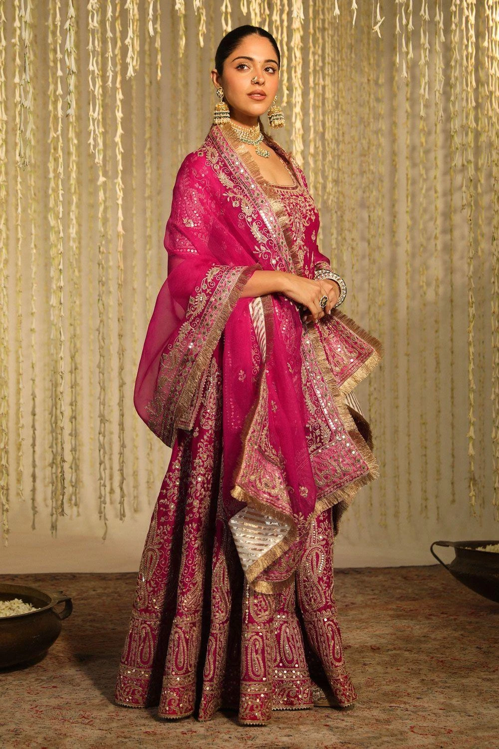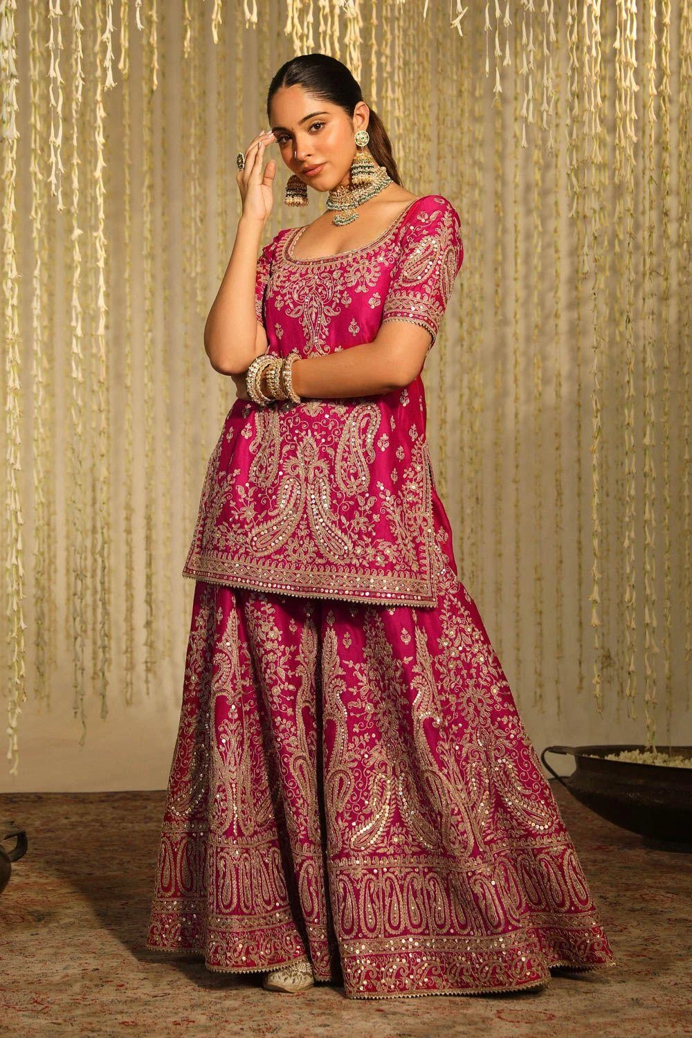 Elegance echoes in Mazneen’s pure silk chanderi kurta set, adorned with kirandori & sitaara, boasting a round scoop neck & graceful elbow sleeves. Paired flawlessly with a sharara & silk organza dupatta, it’s a delicate symphony of luxury.