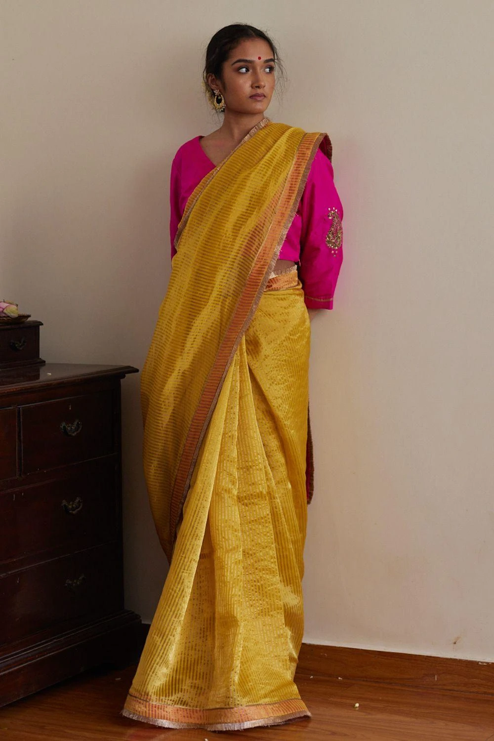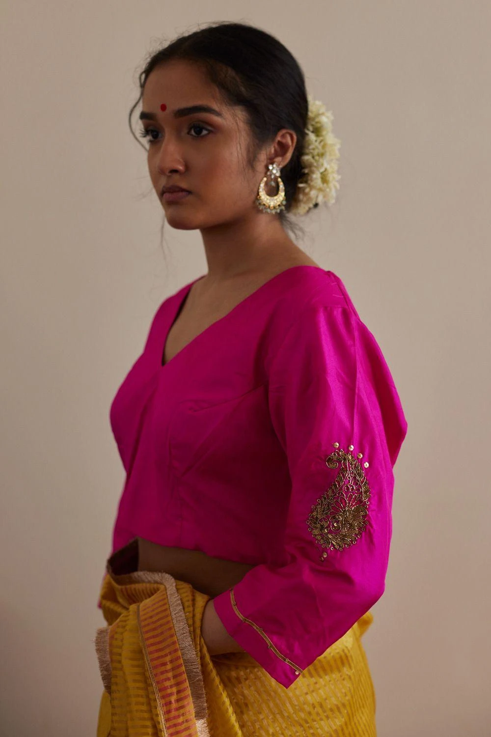 Indulge in elegance with this Hot Pink Ambi blouse. Meticulously crafted from Bangalore Silk, adorned with delicate embroidery and intricate lace trims, it epitomizes timeless sophistication.