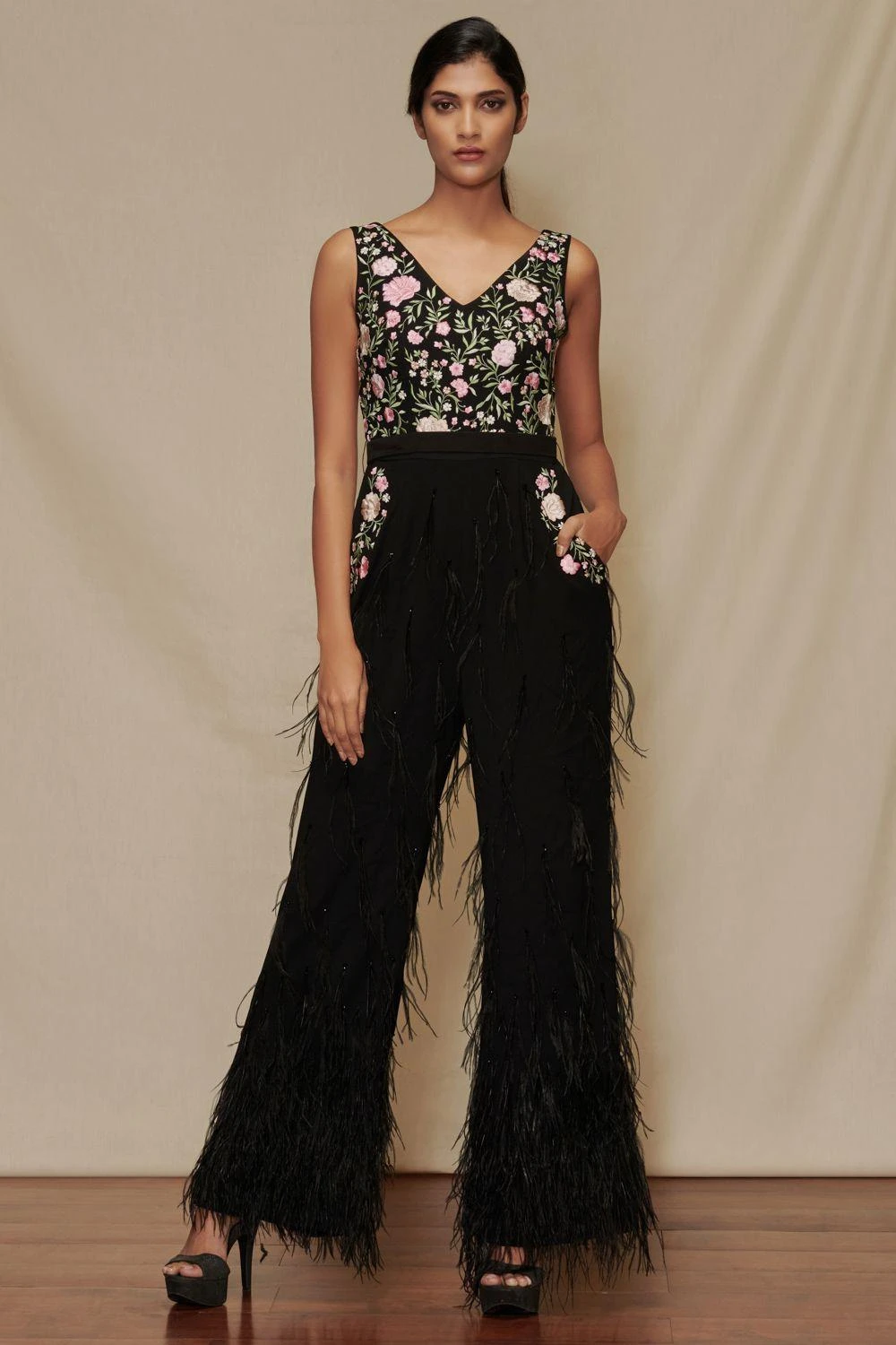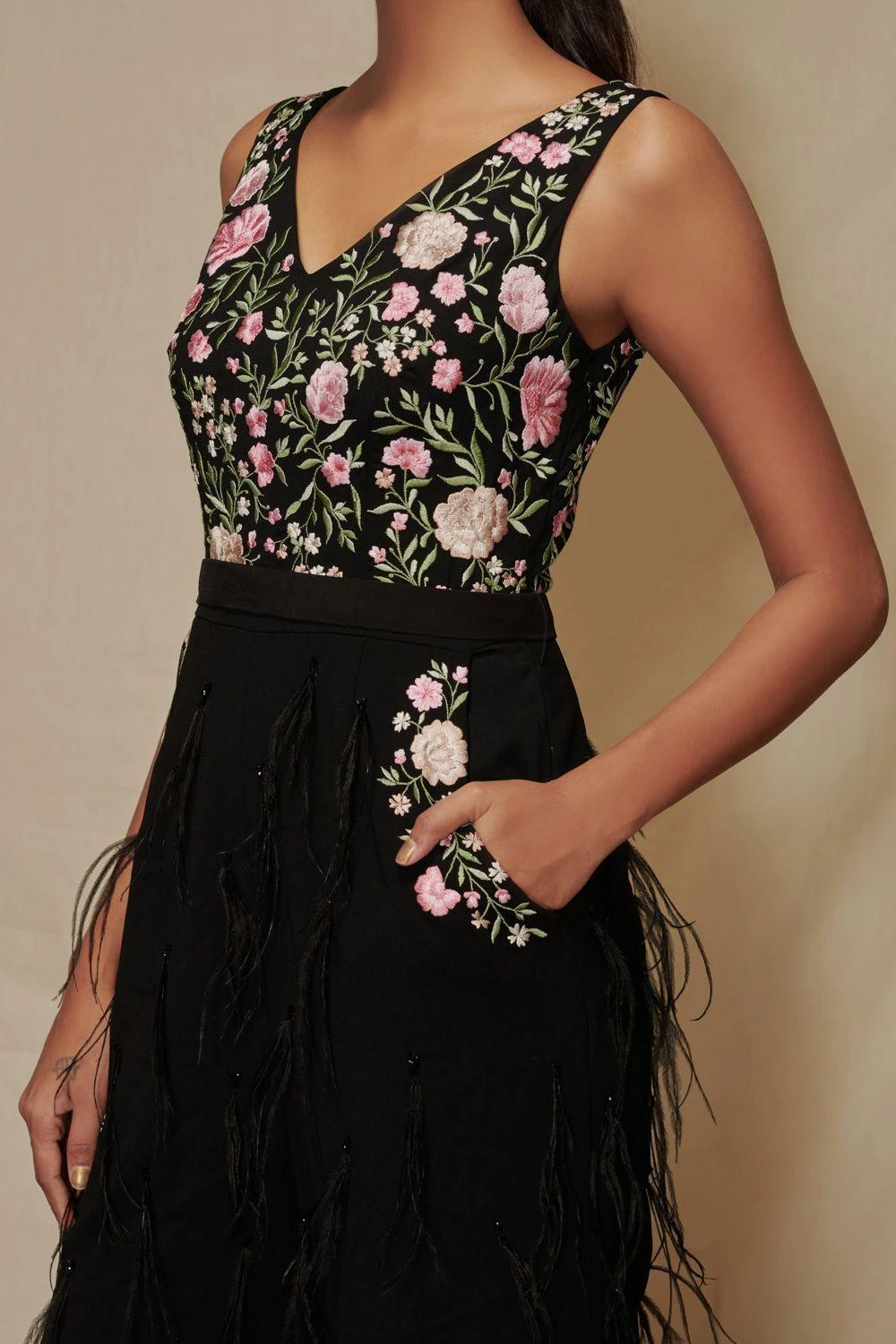 Make a chic & sleek style statement in this black jumpsuit. It is made in a crepe base with a floral embroidered bodice and feather accented bottom. This jumpsuit is everything you need to create some drama.