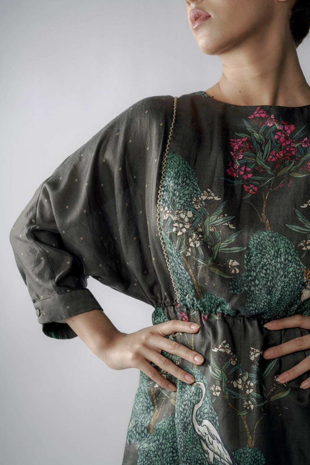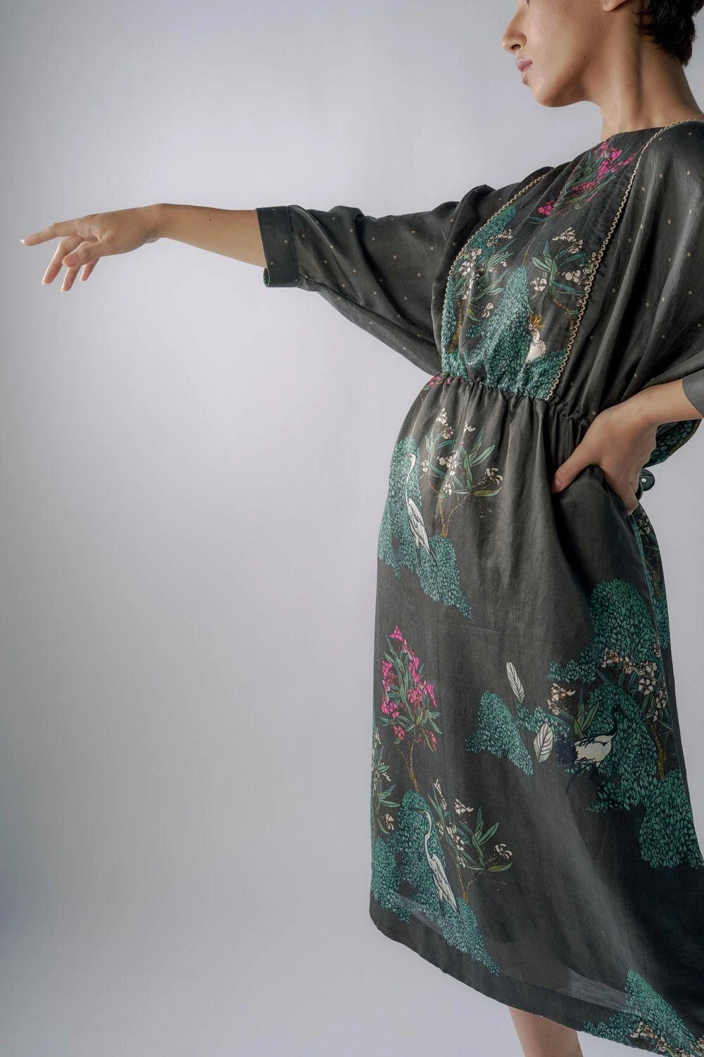 For an everyday elevated look, this comfy chic grey printed dress is a great pick. It is cut in 100% silk with waist gathering detail. You can dress it up with a pair of gold hoops & chic flats.