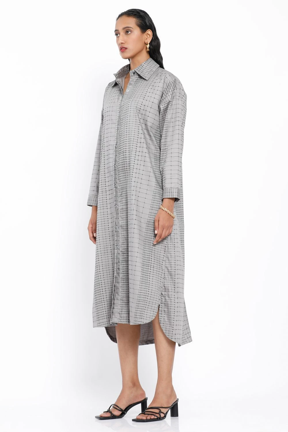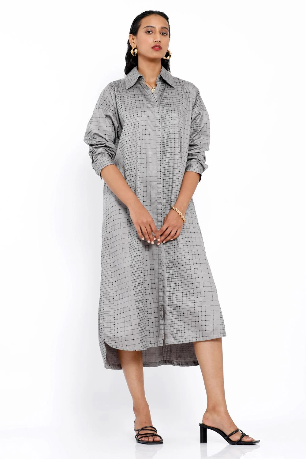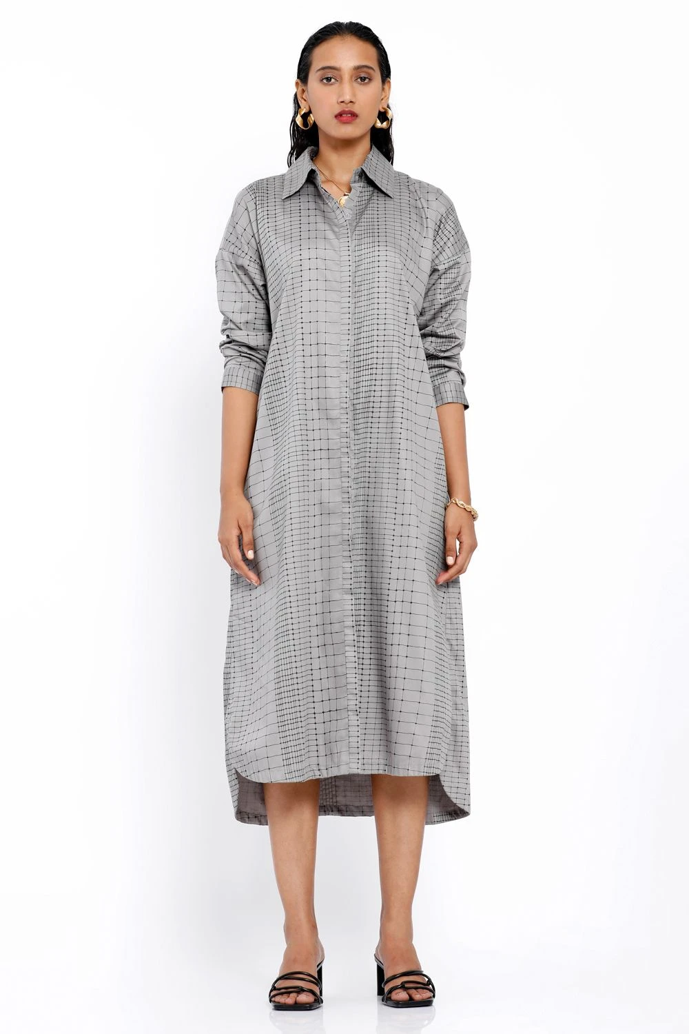 This grey printed shirt dress is perfect for casual daytime outings. Set in a premium cotton fabric this summery piece can be styled with gold or silver hoops & a handbag for a chic lunch look.