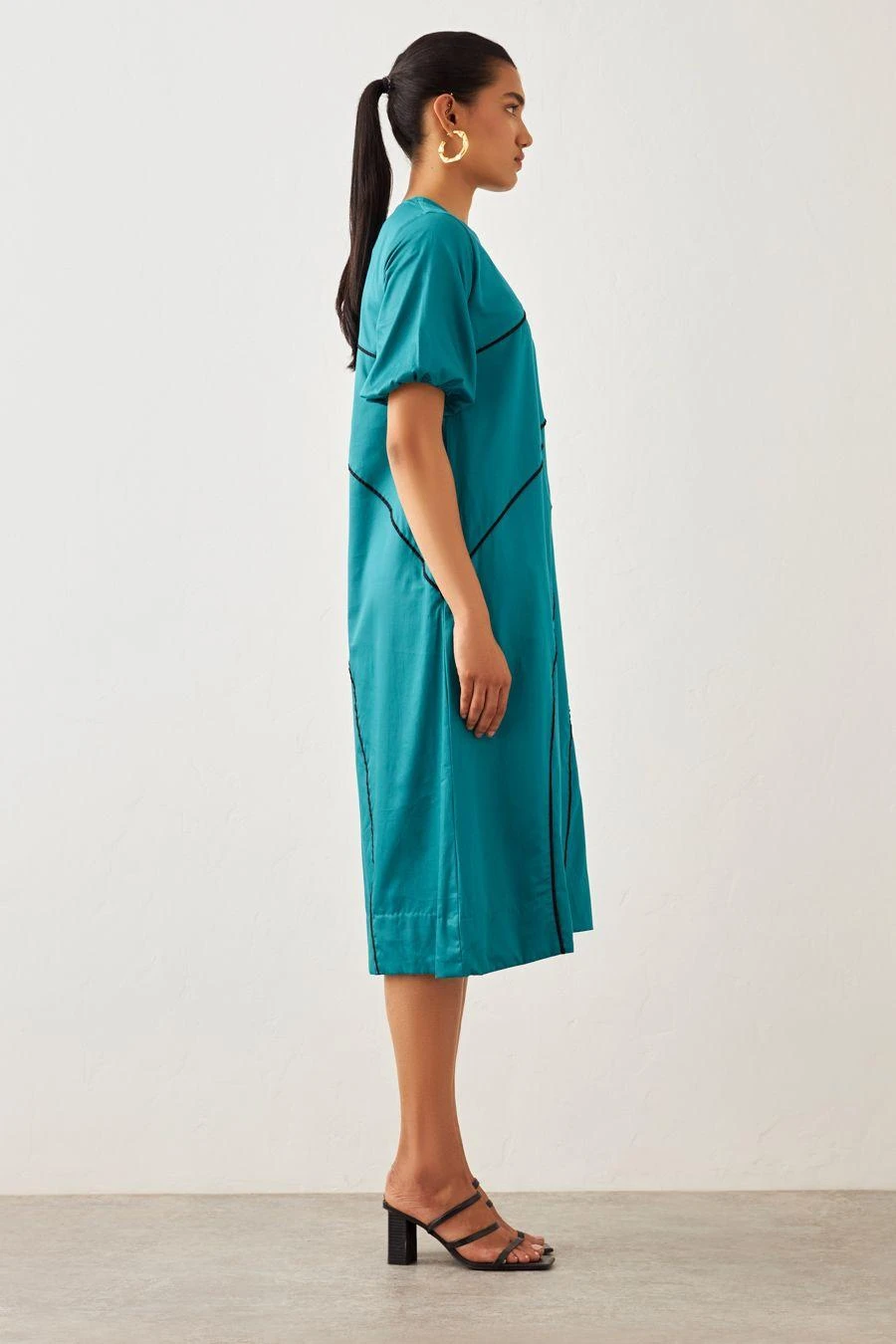 From your work desk to the brunch table & from lounging at home to catching flights, you can always count on this dress. Crafted in cotton, this dress features voluminous sleeves with a contrast curved piping detail.