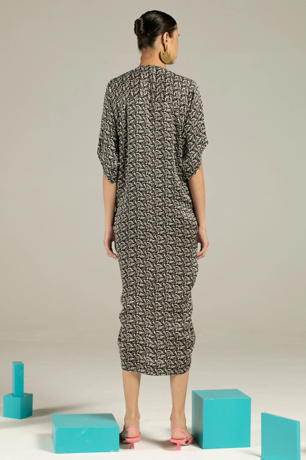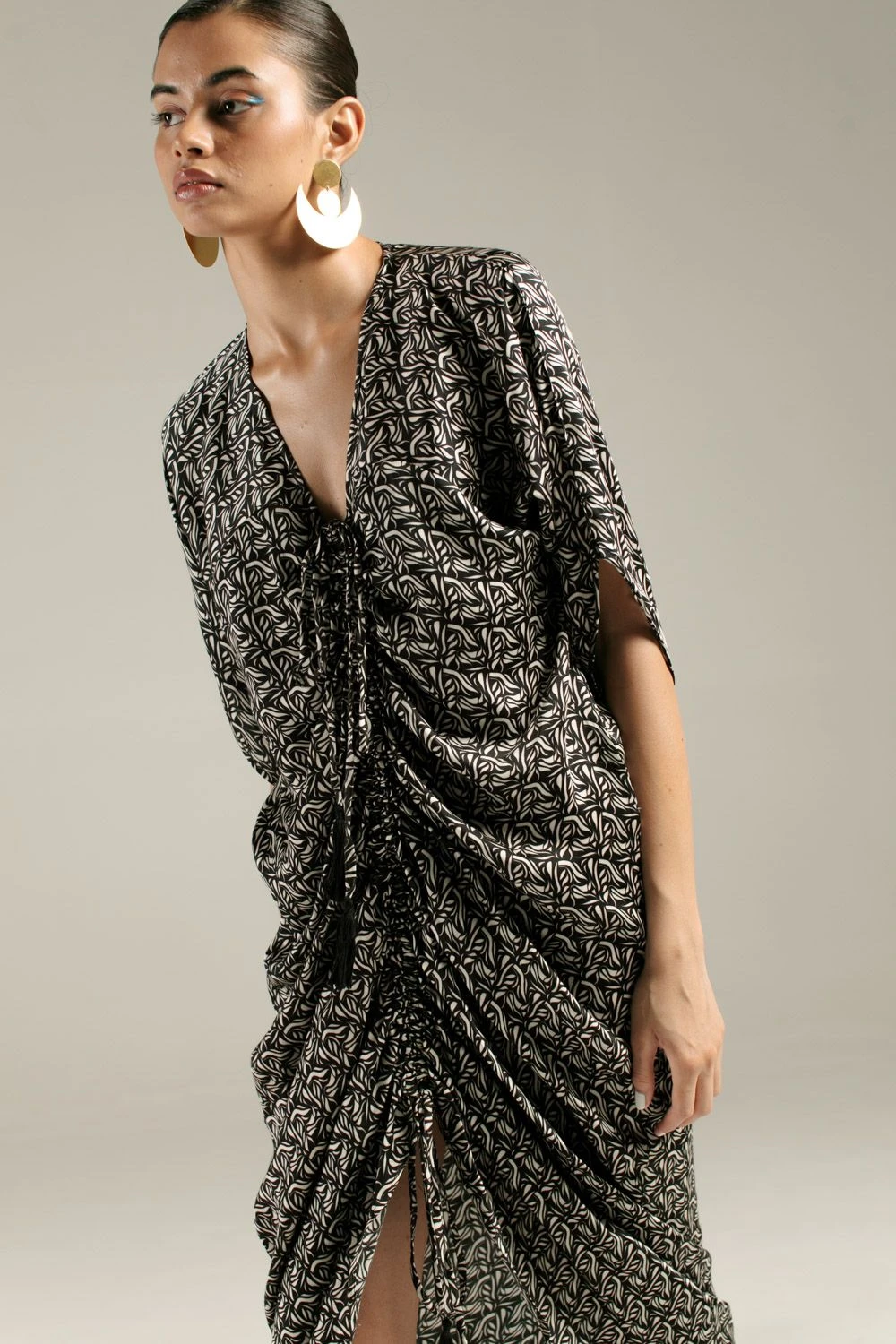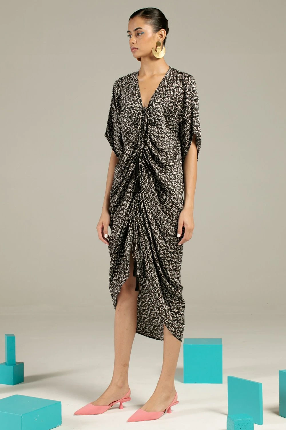 Amp up your holiday closet with this azulik print kaftan. Cut in vegan silk, this comfortable fit kaftan is cinched at the centre and has knotted tassels at the top & bottom hem. You can style it with a pair of statement earrings & tie-up flats.