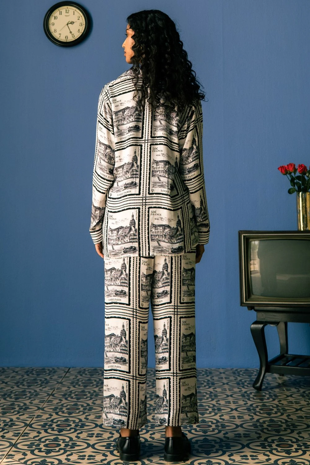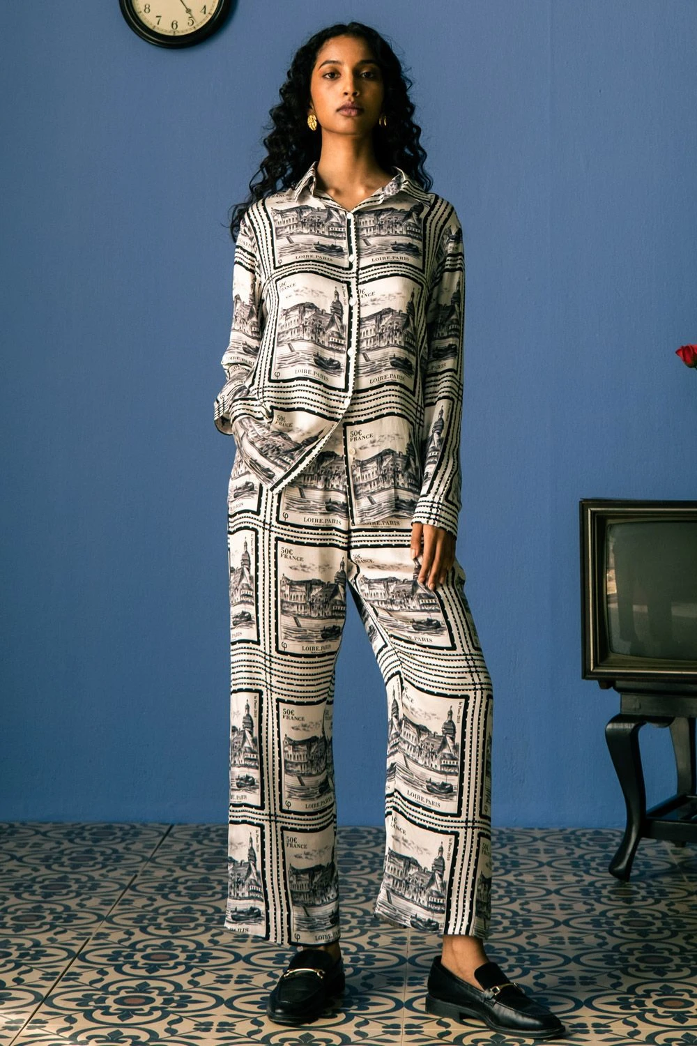 These Paris straight trousers are crafted in stunning vegan silk fabric with hand-drawn Paris stamp print. These comfy chic pants are perfect for travel. You can style it with a matching shirt for a co-ord look.