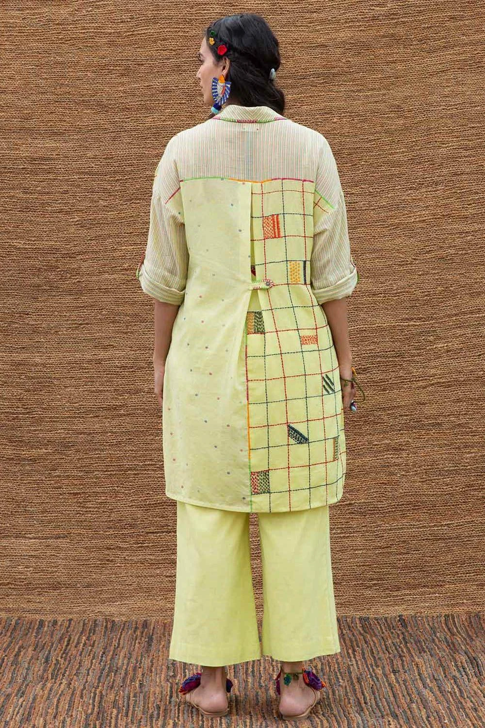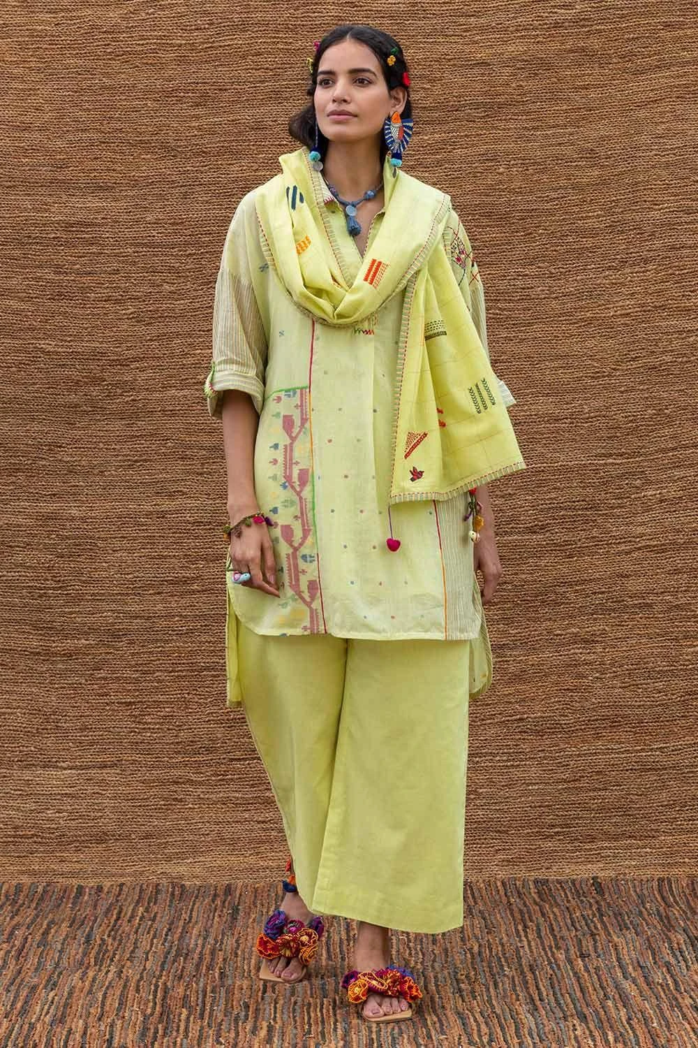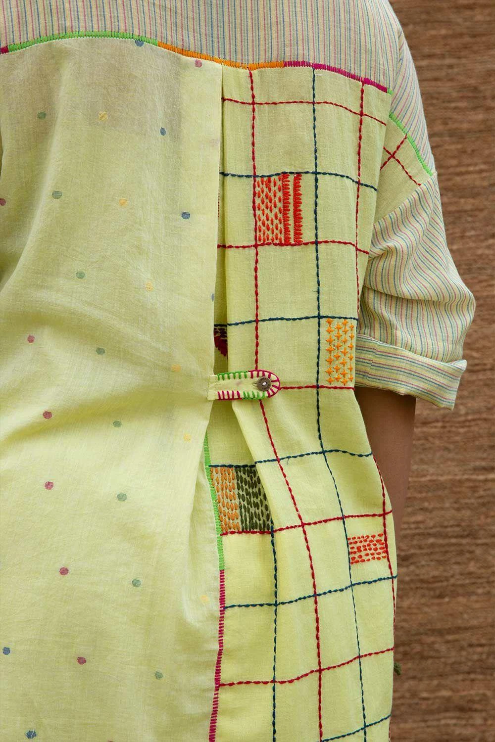 For an everyday elevated look, this high-low green shirt is a great option. It is cut in jamdani muslin textile with wide V-overlap neck detail & side seam pockets. It is also adorned with elegant thread embroidery detail.