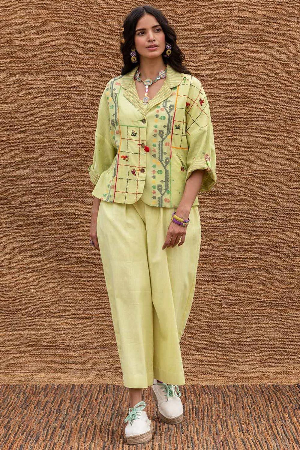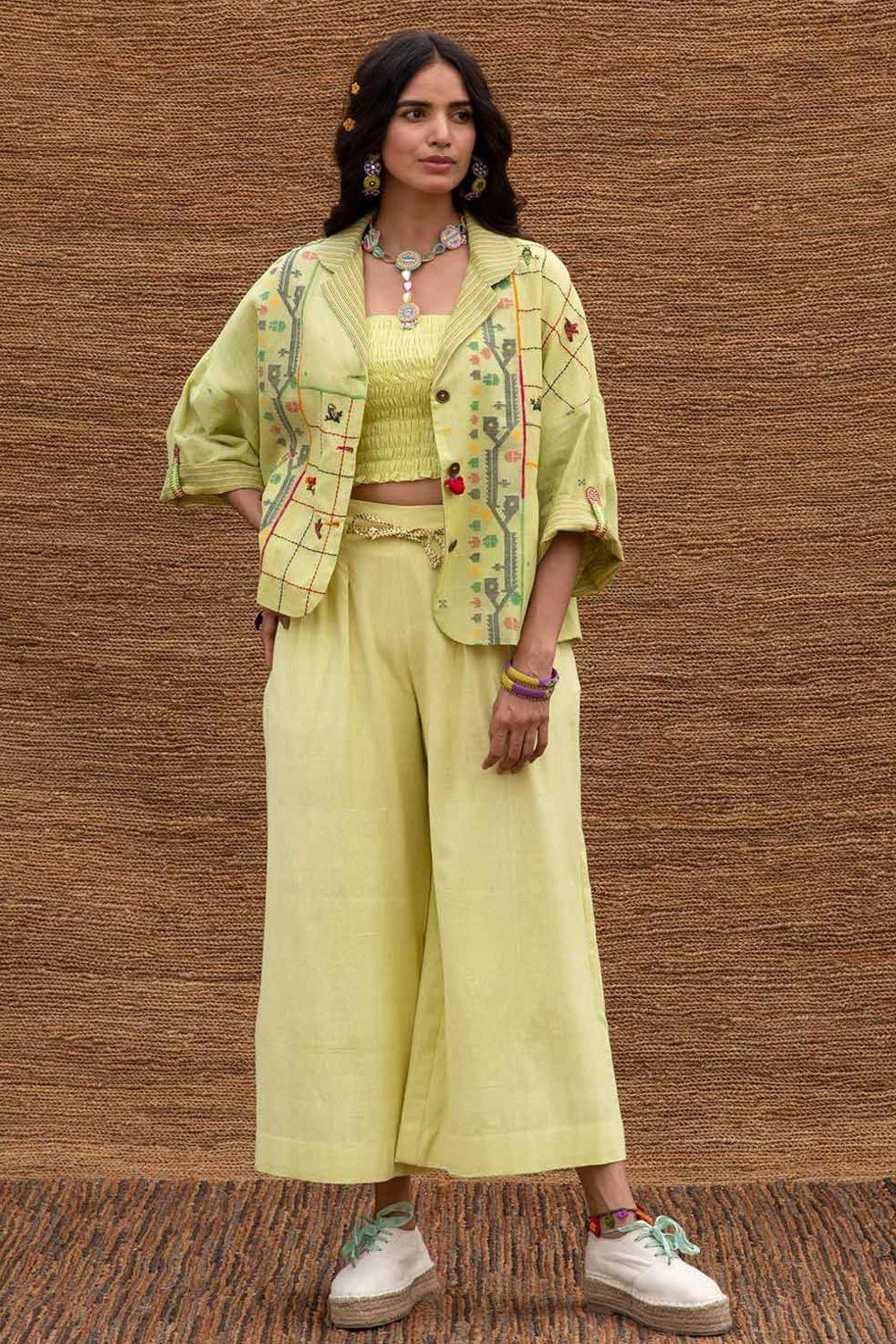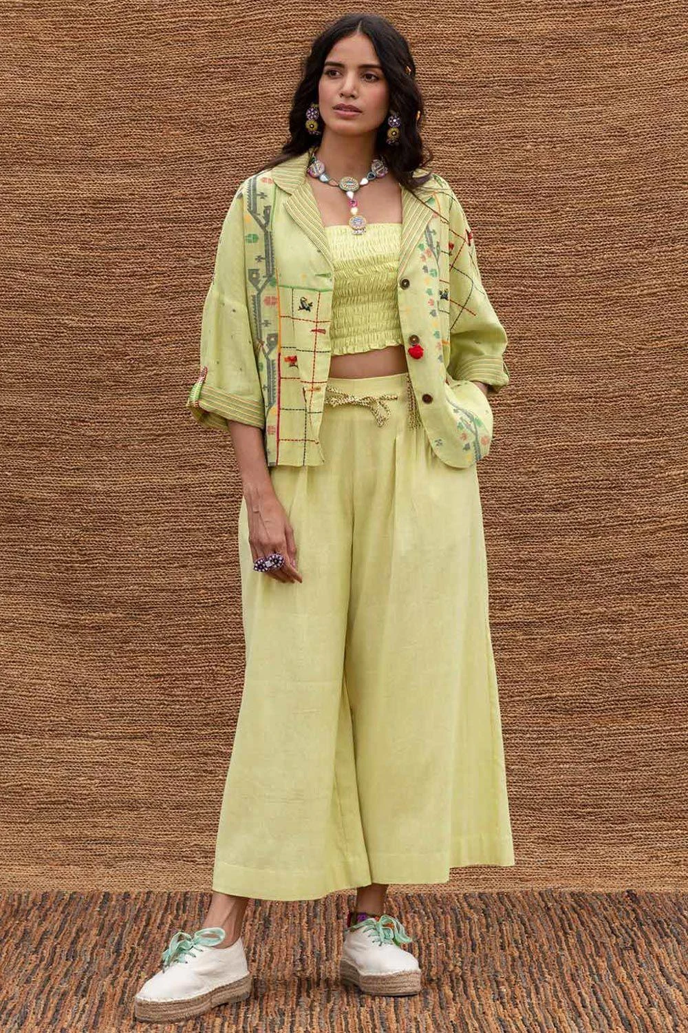 These high waist wide legged pants are cut in handpsun cotton with front pleating & embroidery details. The elastic waist band at the back & drawstrings in the front offer maximum comfort. You can style it with a coordinating dress or shirt.