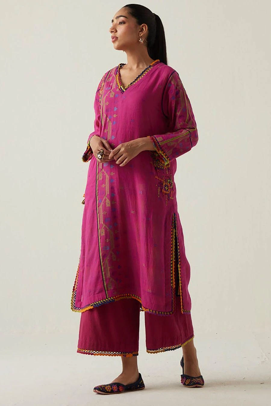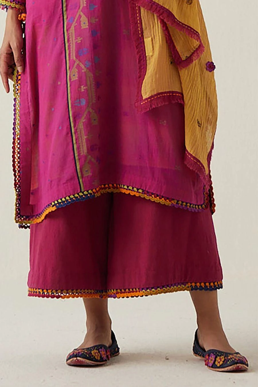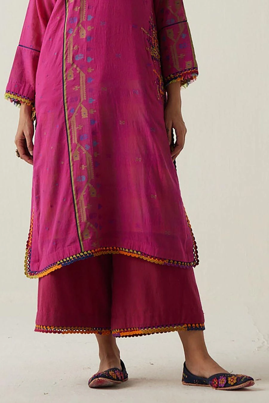 These wide legged khadi ijar, feature a multicoloured crocheted lace at the bottom hem. The elasticated back with front drawstrings is for maximum comfort with pockets.