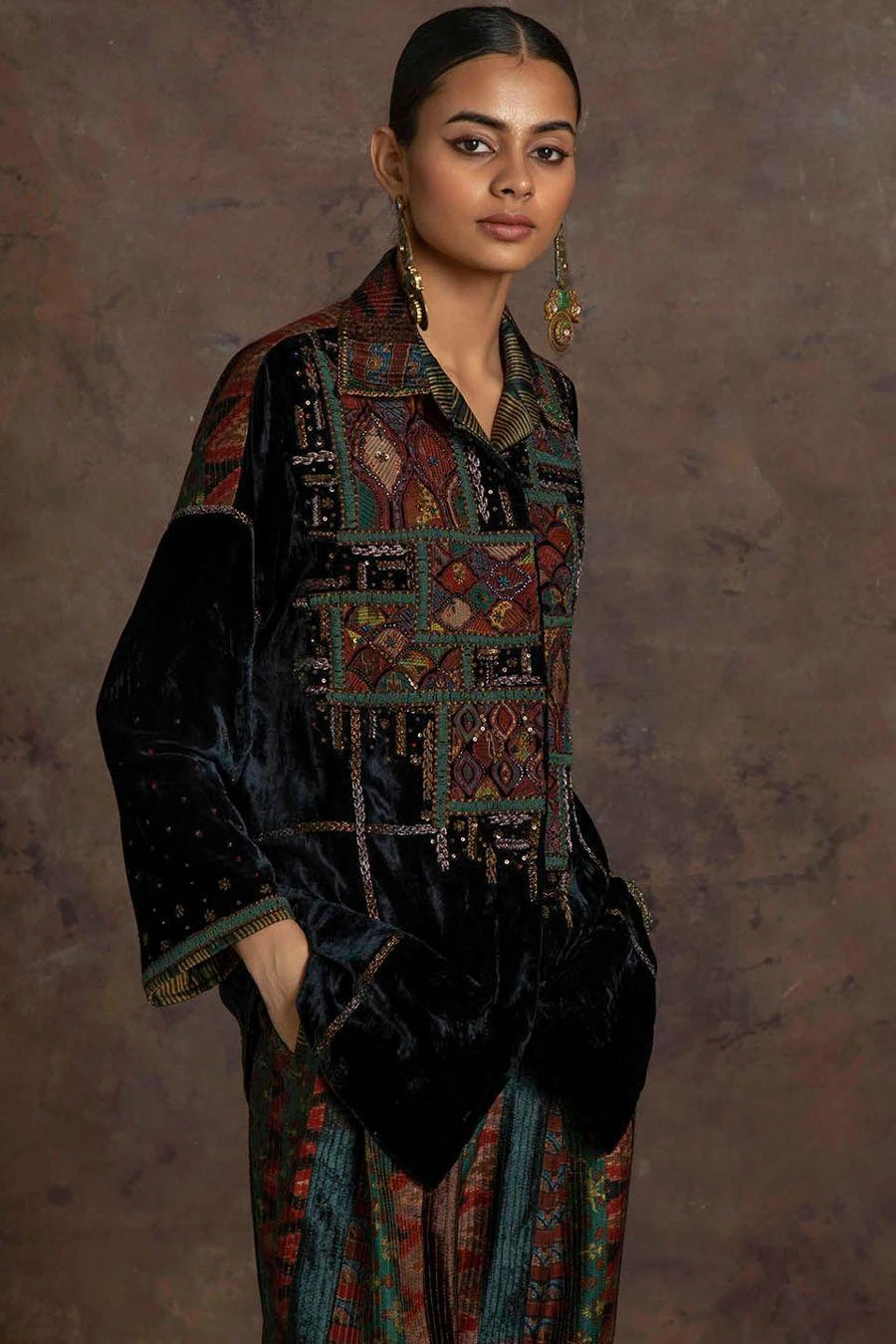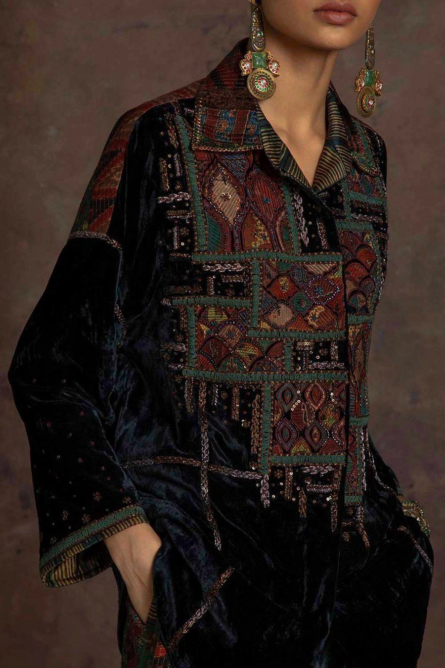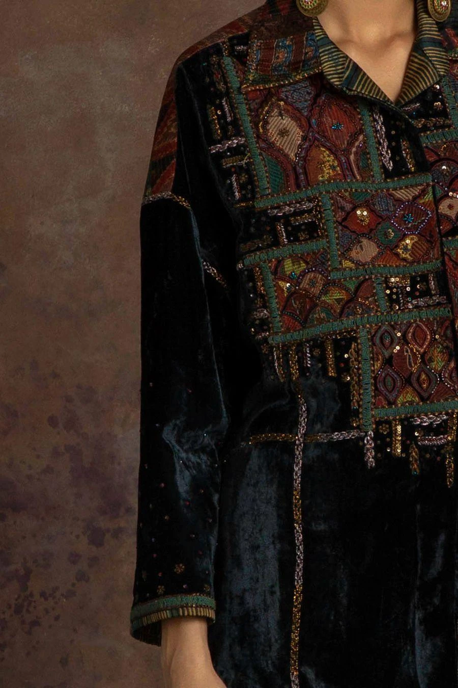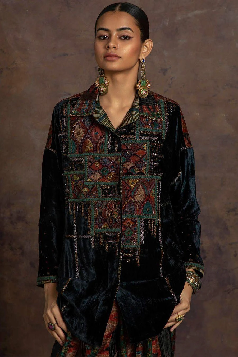The high-low shirt features a classic collar, drop shoulders & long sleeves with colourful contrasting hand embroidered thread work. It features patchwork recycled hand-block printed Bagru silk to create patterns inspired by the Jaali of æRushaansÆ