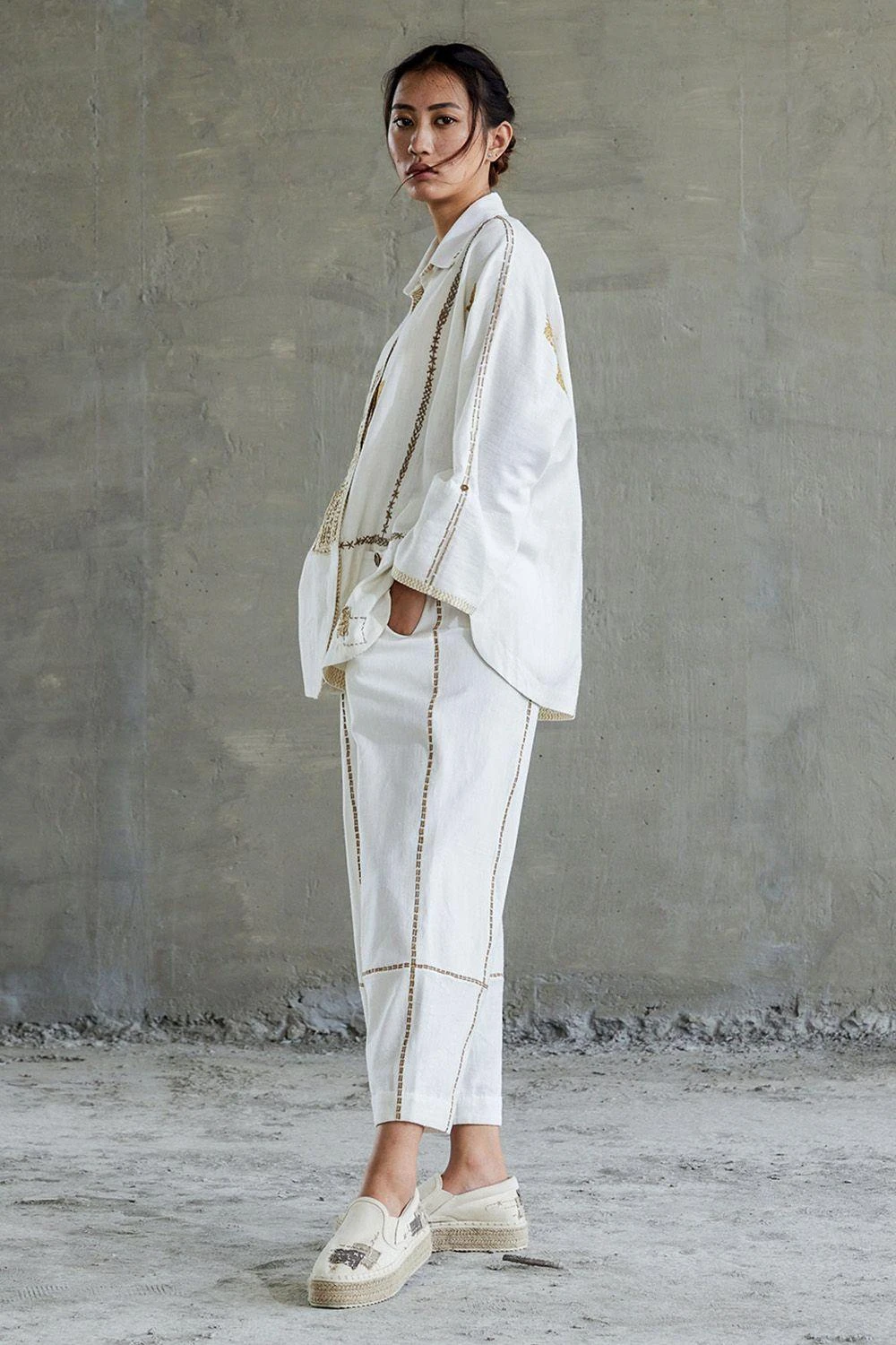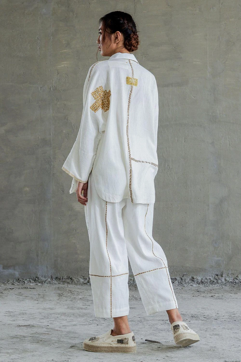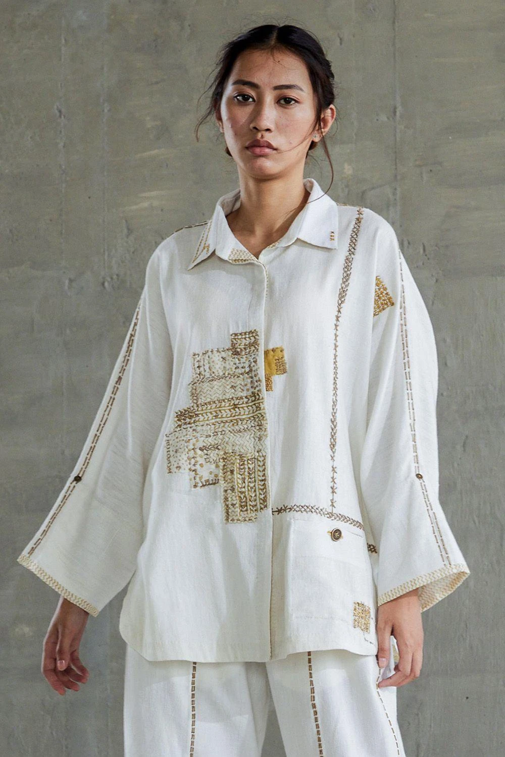 This handspun cotton oversize shirt features a classic collar, concealed front button closure, and kimono style sleeves. With boro style patchwork this shirt features a sashiko stitch accent. It is best paired with shibui denim pant/boho pant.