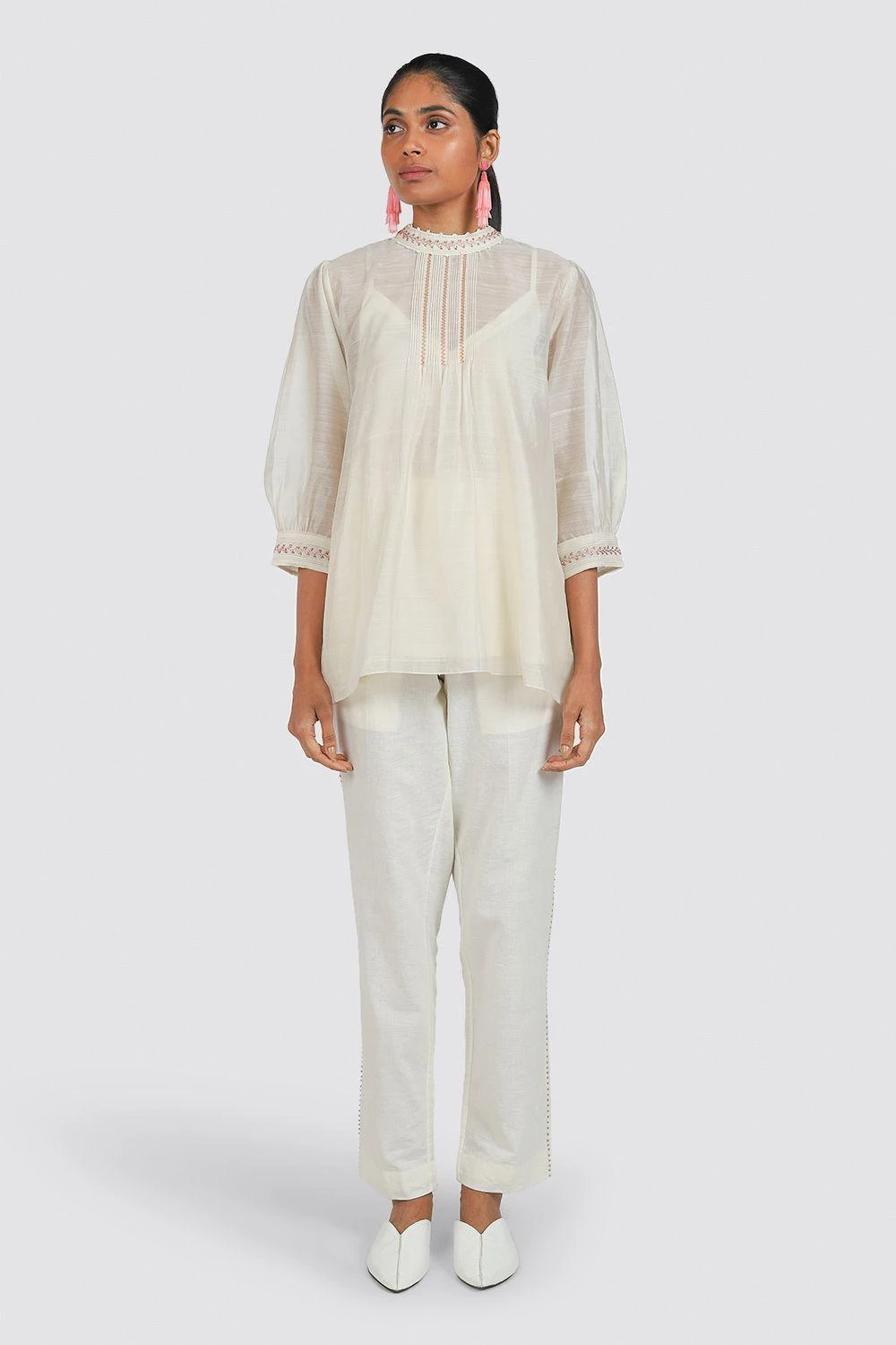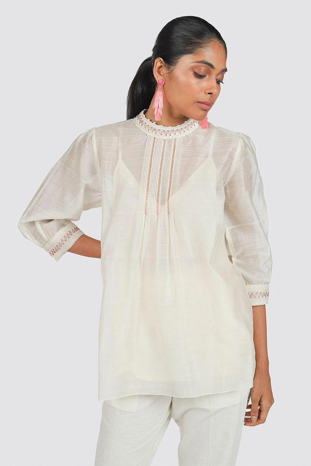 The pintucks and hand embroidery on this classic ivory shirt is what sets it apart.