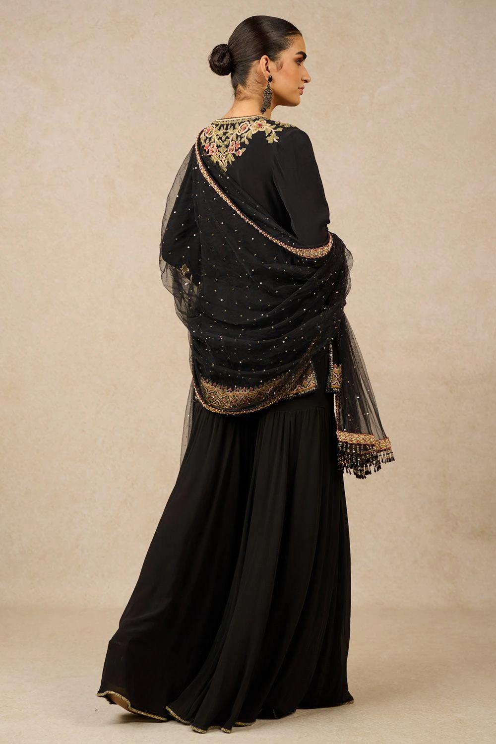 Indulge in exquisite craftsmanship with this kurta, adorned by intricate Gara embroidery. Paired seamlessly with a matching sharara, and complemented by a hand-embroidered tulle dupatta featuring charming tassels for a refined ensemble.