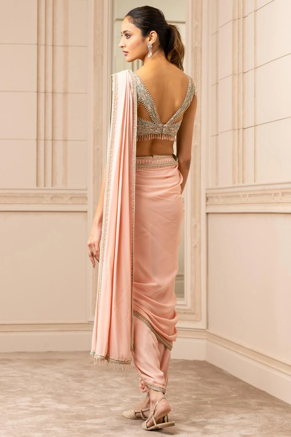 An elegant day function calls for something like this blush pink dhoti drape sari with an embroidered border & subtle tassel detailing. It is paired with a floral printed fluted blouse with tassel detailing on the sleeves.