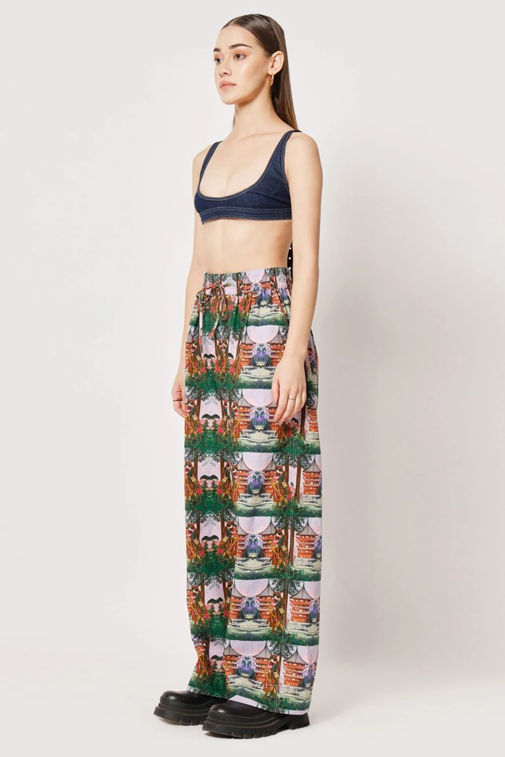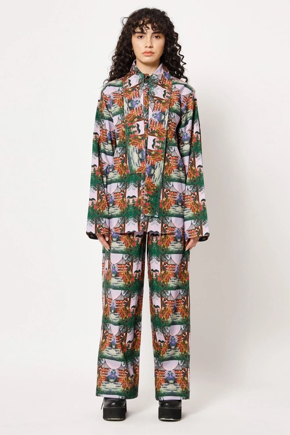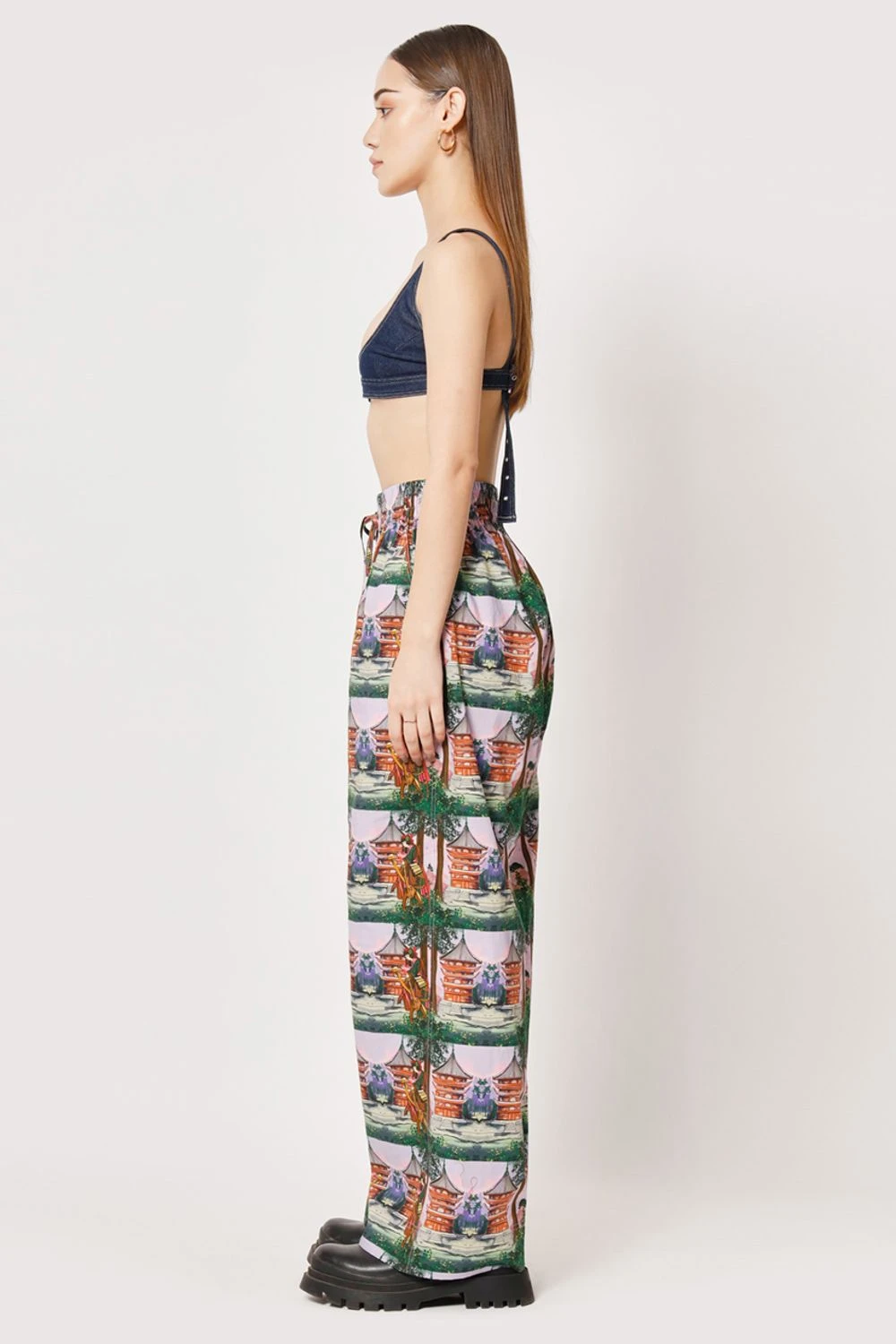 Indulge in comfort and style with these relaxed straight easy fit pants. The elasticated waist ensures a perfect fit, while the captivating digital print, showcasing a samurai girl transformed into checks, adds a touch of artistic flair.