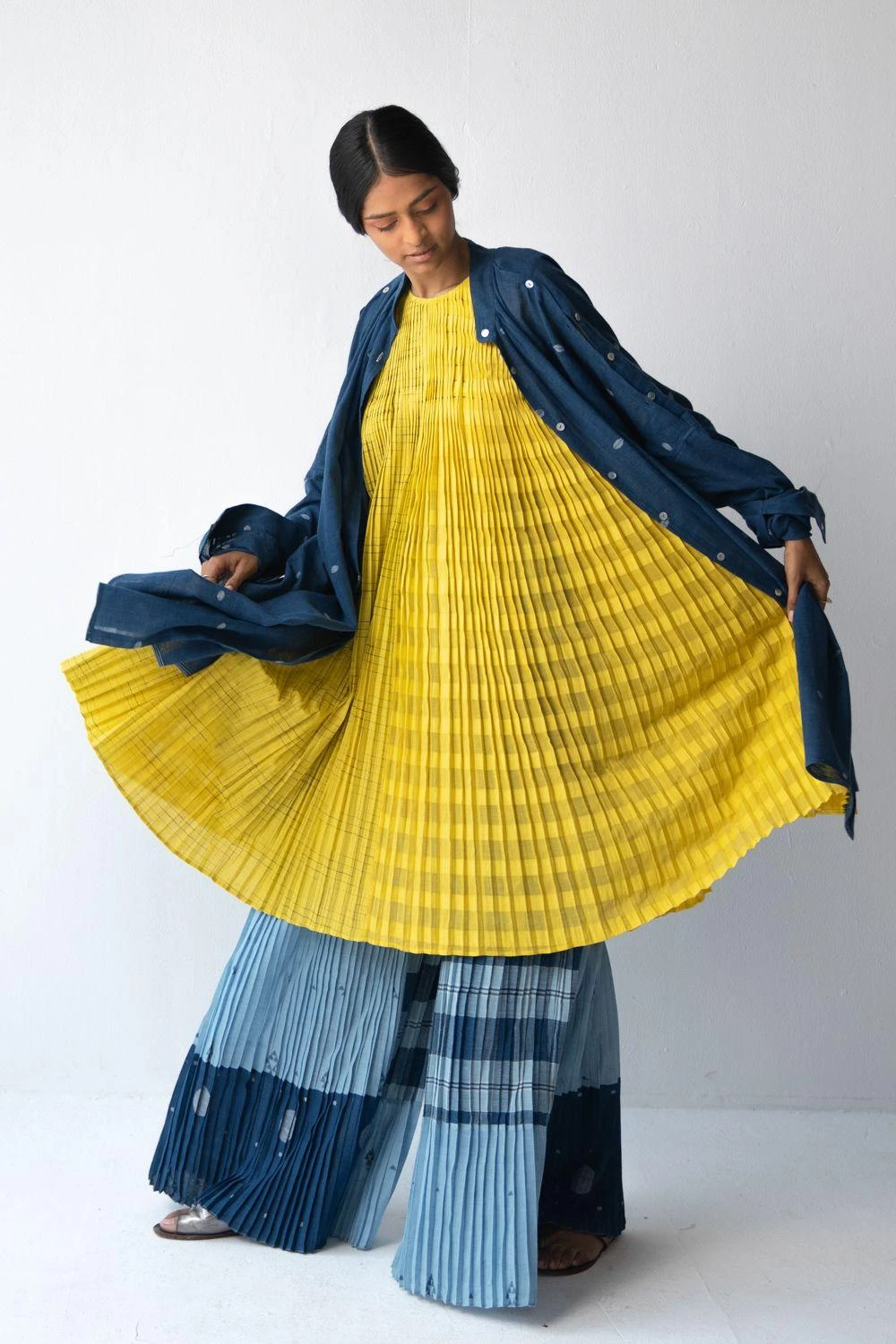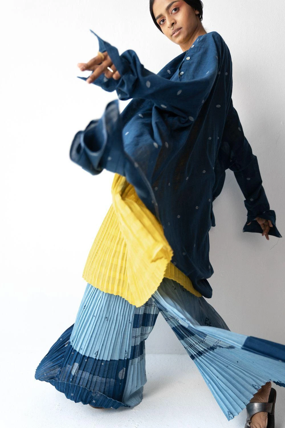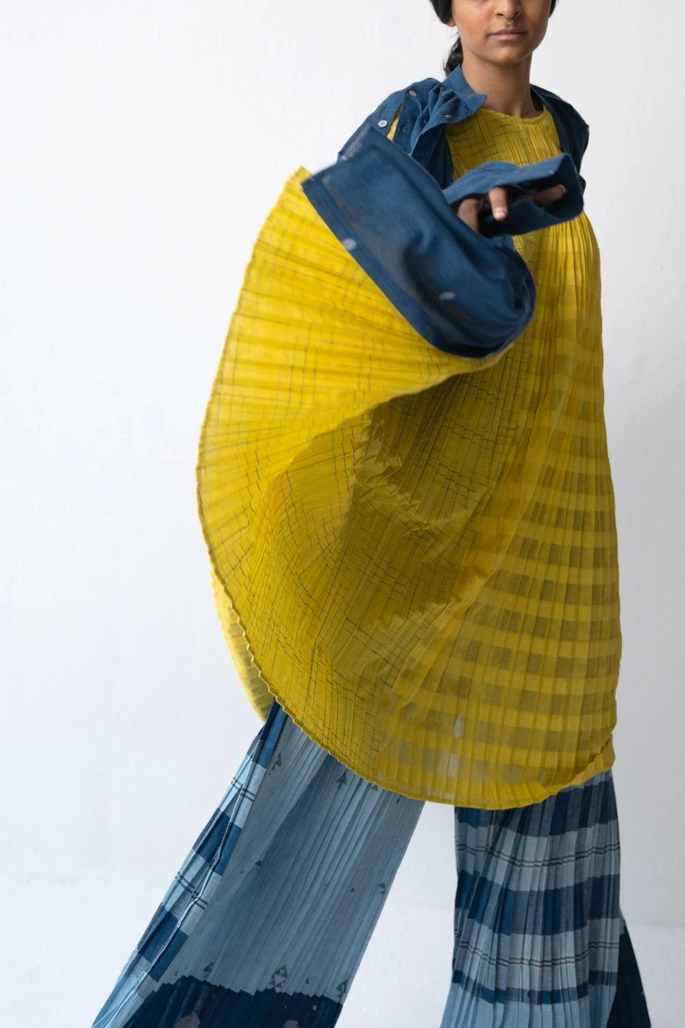 These micro pleated pants are super stylish and will provide utmost comfort at the same time. They are handwoven in upcycled patchwork cotton jamdani fabric in a wide legged silhouette. Style it with a white tunic top with minimal gold accessories.