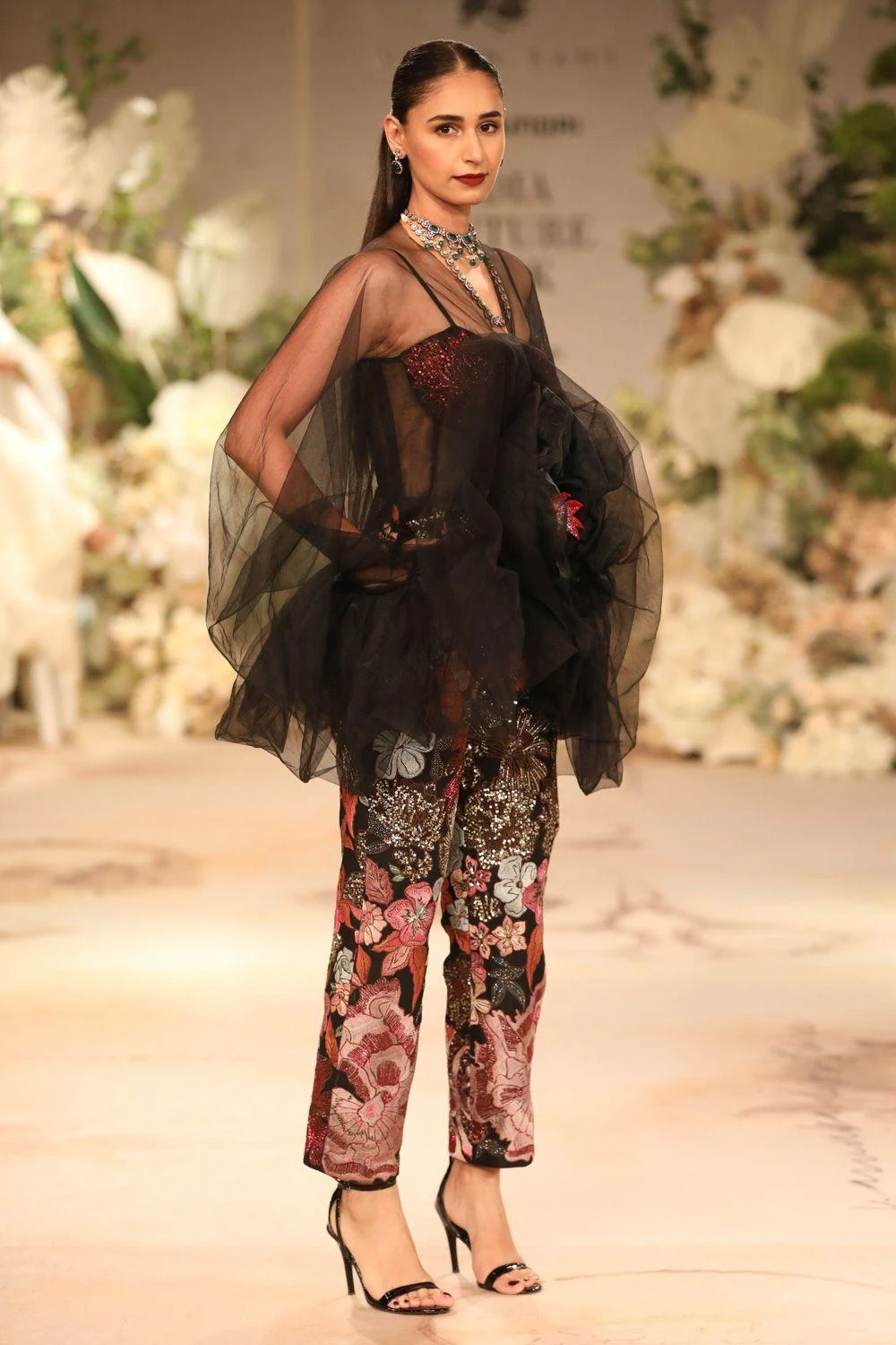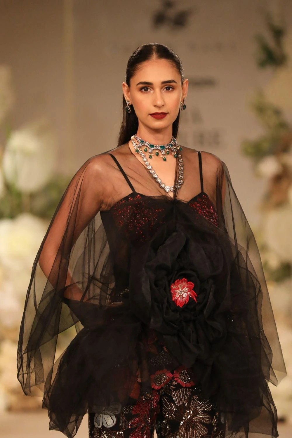 The corset bodice boasts resham embroidery adorned with sequins, bugle beads, and colorful drops for a glamorous touch. Paired with a net cape featuring a draped floral detail, it’s a captivating ensemble.