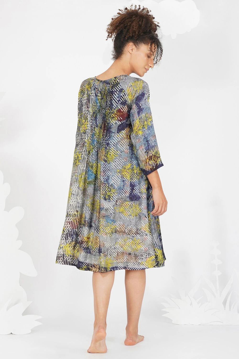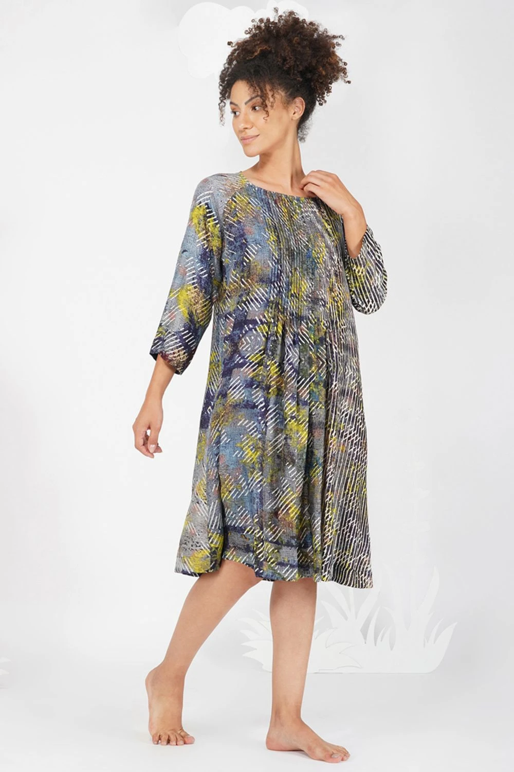 Laid back silhouette & contemporary hues is what you need to amp up your closet. This alina dress is created in silk with impressionist print using vivid colours. You can easily dress up or down, using few tricks of styling.