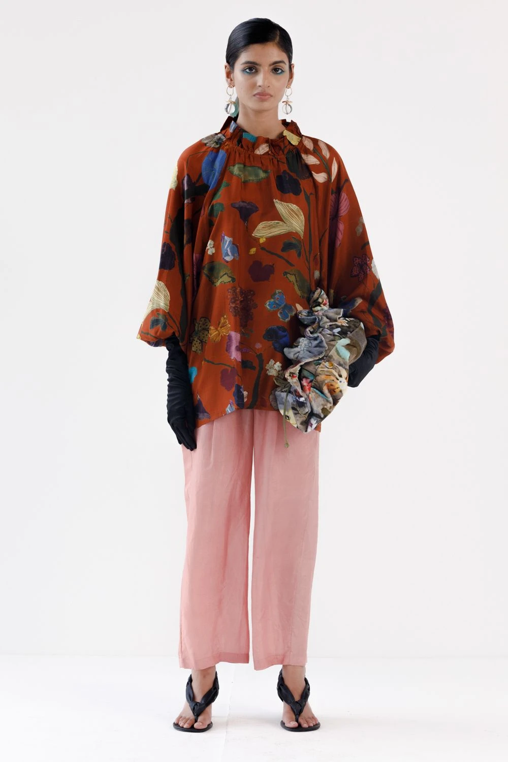 Look effortlessly stylish with this silk top. Featuring delicate floral patterns, puff sleeves, and an elasticated ruffle neckline, it encapsulates the essence of nature’s beauty.